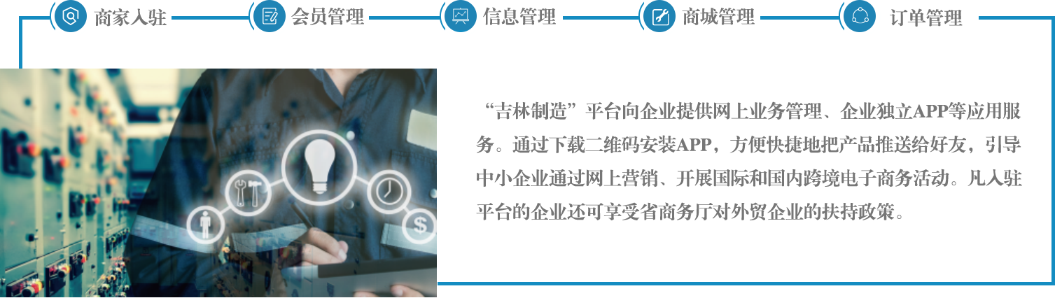 “吉林制造”跨境電子商務(wù)平臺是由我公司開發(fā)的新型電子商務(wù)平臺,是針對吉林本地制造業(yè)進行深度宣傳、拓展產(chǎn)品銷售、提升企業(yè)管理信息化的B2B跨境電子商務(wù)網(wǎng)絡(luò)平臺。 平臺目前正跟隨國家“一帶一路”方針開展吉林省制造業(yè)跨境電商項目,與吉林省商務(wù)廳合作,帶領(lǐng)企業(yè)“走出去”參加境內(nèi)外展會,將萬余款平臺企業(yè)產(chǎn)品推向?qū)粜陆z路,進一步為吉林制造業(yè)產(chǎn)品海外銷售引領(lǐng)方向。